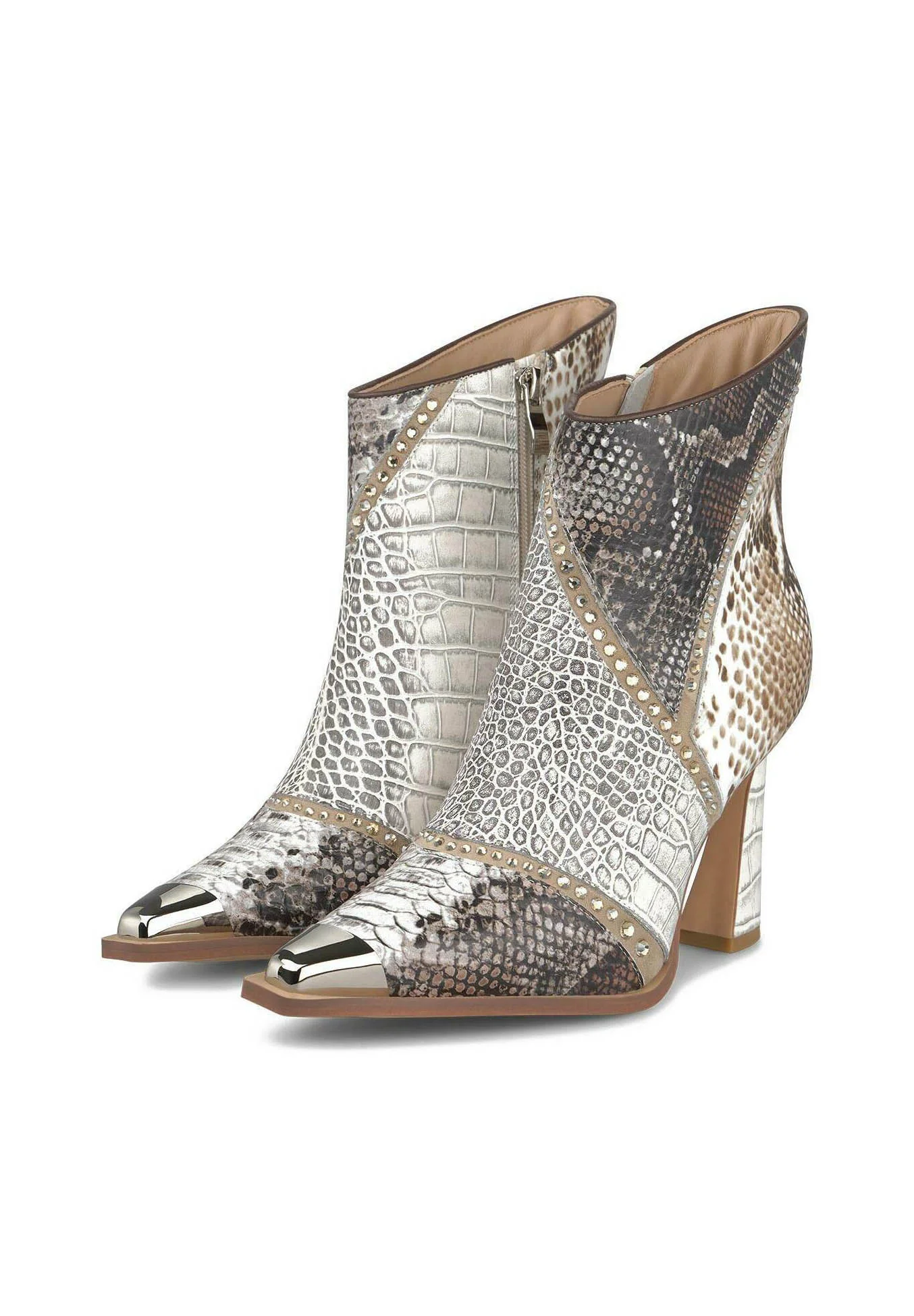 Botines Alma en Pena elaborados en piel con textura de pitón y estampado animal print y aplicación de pedrería.